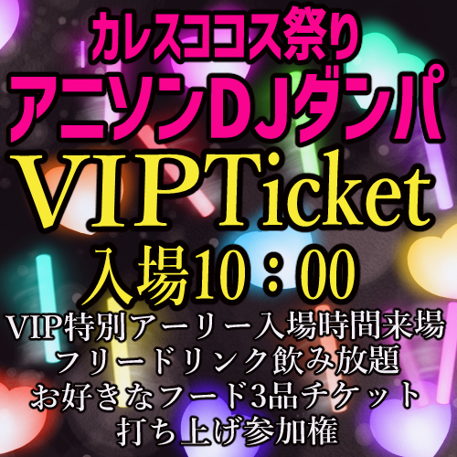 今回のイベントでもVIPチケットをご用意しました! 何と限定5名様のみ! 早い者勝ち!!! イベント終了後の打ち上げにもご参加可能となってますので、よりカレスコイベントの一日を満喫したい方にもお勧めです!